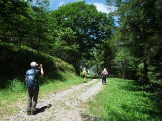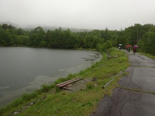 | 大雨の八千穂高原 (松原湖) 確実な大雨の予報に、ふだんなら即刻中止の木曜山行だったが、名古屋のやまんばさんをはじめ、神戸、東京と遠路のお客さんがそのために前泊していて、雨がどうしたと行く気満々で、そのうえ、地元から初参加のMさんまでが行きますとあっては中止するわけにはいかない。 とはいえ、山登りというわけにもいかない。というので困ったときの八千穂高原へ出かけることにした。選んだのは八千穂レーク大回りコースである。白樺をはじめ、終始美しい林の中を歩くのは、雨の中でも風情があった。晴れていたって、それほど歩く人はいないのだから、大雨とあっては人っ子一人いない。 こんな日でもルンルンと歩けるなら楽しみは無限大ですな。雨もまた良し。物事はいい方に考えるべきである。皆さん、お年を召してもお元気なはずだと納得させられた。 |