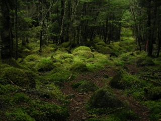 このコースのハイライトといってもいい苔の森歩きでは、近年にないひどい雨に見舞われたが、北八ッでもっとも歩きやすい道だったのが幸いした。森の中で昼休みにして、ゆっくりと苔の森を楽しむつもりが、とてもそれどころではなかった。しかし、驟雨の苔の森なんかわざわざ行くことはないと思えば記憶には残る。