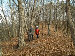 今回、楽に登ろうと選んだ登路は、植林が成長して以前の印象とかなり変わっていた。しかしそれも麓近くのことで、主稜線に出てしまえば、美しい林はそのままだった、深く積もった落葉を踏んで明るい林を歩く気分は今の季節の醍醐味である。
