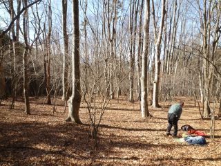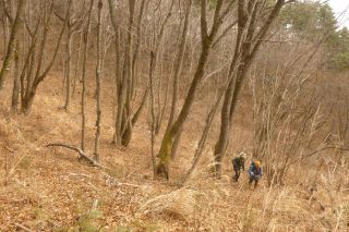 この山麓に縦横無尽に通じる作業道を見つけて下ってみる。途中、20本はあろうかというケヤキの大木の林があって、そこで昼休みとした。葉をつけているときに、もう一度行ってみたいところである。