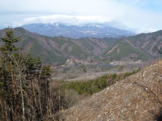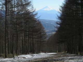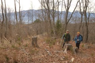伐採地の上部まで登らずとも、林道からの眺めはすばらしい。あいにく、山々がすっきりと見られる日ではなかったが、想像はできる。それにしても、まるで3月のような陽気で、前週の八ヶ岳横断歩道での寒さがウソのようである。風が吹くと気持ちがいい。