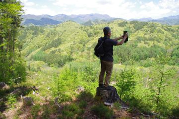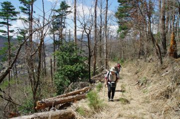 そして、肝心の尾根歩きは当然ながらすばらしかった。「ほとんど奇跡のような」と前回表現したのがあながち大げさではないと、参加された方々も感じたことだろうと思う。地面の柔らかさ、樹林の良さ、そして何より圧倒的な静けさ、さらには歴史的価値。登るにつれて緑の色が淡くなっていき、ところどころでその中にヤマツツジの濃い橙が映える。