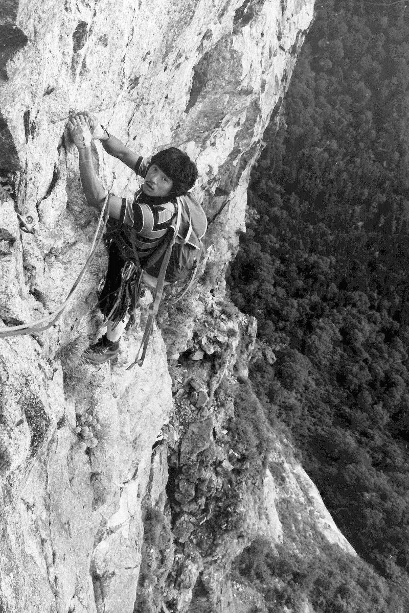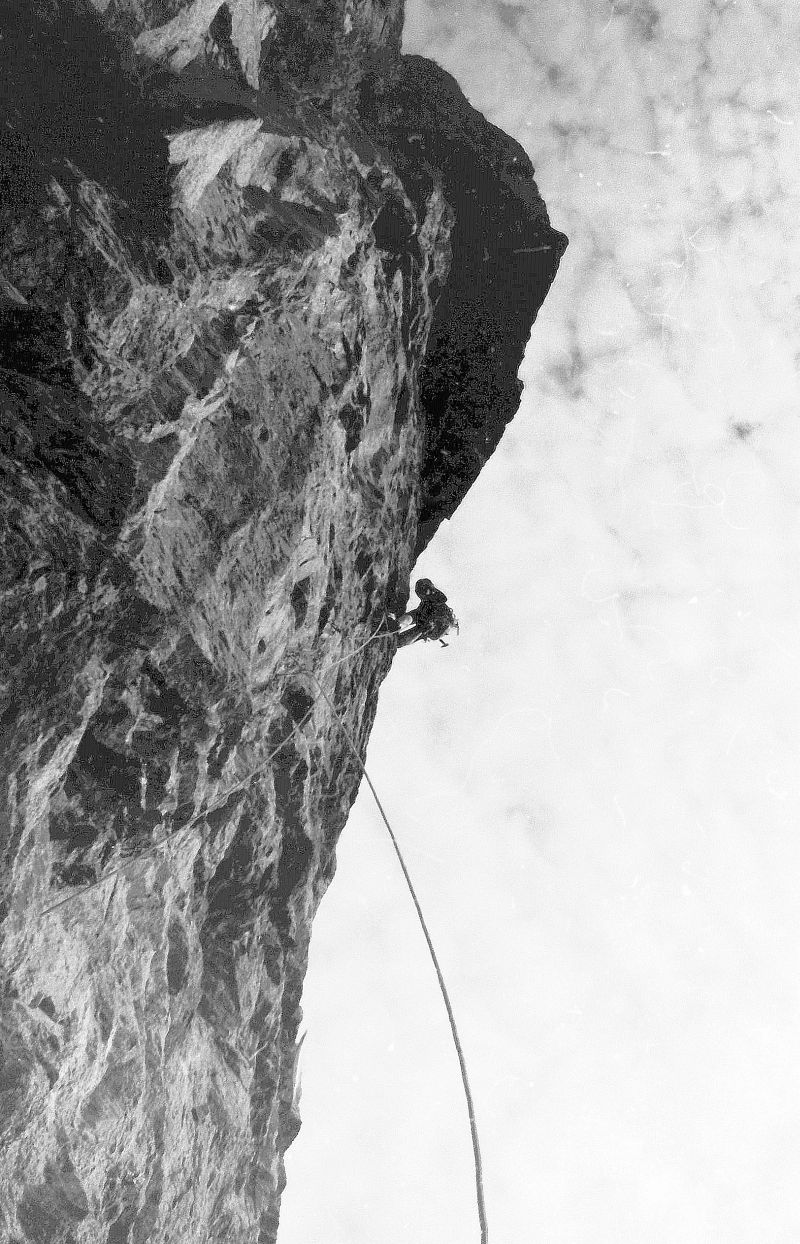 | V.初秋の空間を舞う 穂高屏風岩東壁青白ハング 1973年9月上旬撮影 ウィンパーが活躍していた時代は、山頂に立つためのもっとも容易な登路にこそ価値があるとされた。今流にいえば「百名山最短コース」である。やがてA・F・ママリーが登場し、登山そのものの面白さを求めることこそ、その本義であるという考えに至り、現代の一線に引き継がれた。かくて今もなおママリーの末裔たちは世界の山々を舞台に様々な面白さの可能性を追求している。地上の未踏峰は尽きてもママリズムは永遠なのである。 ![]() 岩壁の登路も同様で、初めこそ岩の弱点をつないだ論理的なものだったが、初登以降はクライミングの面白さを求めて数多の酔狂な登路が開かれた。青白ハング帯を登るこのルートもその一例で、垂壁を避けるように好んで壁の前傾部分をたどり、さらにオーバーハング帯最上部の大岩庇を越えるのである。埋め込みボルトで開かれたこのようなルートの初登と再登の困難度のちがいは天と地ほどの開きがある。岩にボルトの穴を穿つ作業がない再登以降は、苦も無く大空間のトリップを満喫できるのである。言うまでもなく登攀中に味わう露出感は半端ではなく、それがこのルートの持ち味でもある。 ![]() 目が回るようなロケーションを求め、写真撮影を目的に I を誘って青白ハングへやってきた。青白ハングには何度か登っていたから撮影ポイントもよく分かっている。天気はよいし登攀も順調。なにもかもがうまく運び、極めつけの大岩庇を鼻歌交じりで越えていく I だった。 |