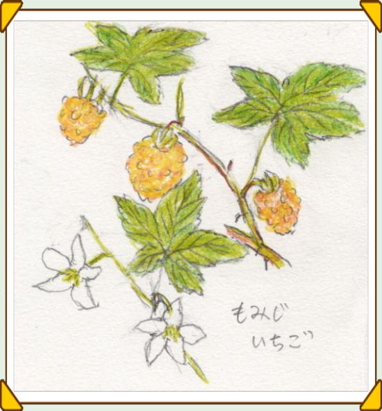 初夏から梅雨あけのころまでが野山のいちご類の季節で、この仲間は結構多く、わたしが知っているものだけでも10種類ほどはある。 大きく分けて草いちごと木いちごがあり、今回取りあげたなかでは、へびいちご類が草いちご、もみじいちごは木いちごで、木いちごにはとげのあるものが多い。 もみじいちご(〈紅葉〉苺)は、山道のかたわらによく見かける小形の木いちごで、葉の形がカエデ(楓=紅葉)に似ているためにつけられた名だ。春、割合に早くから、枝先に白い5弁花をうつむいて開く。 果実は、6〜7月の梅雨のころ、黄色に熟す。果汁の詰った小さな粒々がぎっしり丸くかたまった実は、そのまま食べてもよい味だ。 ジャムにも果実酒にもなるが、枝には鋭いとげがある。 山道を歩きながら、ちょうど手をのばせば届くあたりに実がなるので、二つ三つとつまんで口に放り込むと、いっとき口の渇きをいやし、息のはずみをしずめてくれるような気がする。蒸し暑い季節の山歩きの小さな楽しみだ。 |