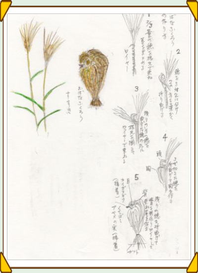 | すすき(薄)=おばな(尾花)は、お月見の頃には、都会の花屋の店頭にも必ず並ぶから知らない人はいないだろう。 雑司ヶ谷の鬼子母神には、江戸時代から伝わる郷土玩具「すすきみみずく」がある。玄関などに飾ると魔除けになるともいわれ、大中小とあって結構な値で売られている。 さて、ここから先は、それと同じでは申しわけないので「おばなふくろう」の作り方といこう。 材料は、若いすすきの穂20本余り、貝殻菊(黄)のドライフラワー2輪(大きさを揃えて)、アヤメの実1個、フラワーデザイン用ワイヤーの28番くらいの細いもの数本、接着剤(木工ボンドなど)。 すすきは穂の開く前の若いものがよい。穂の下20cm余りで切って、図のようにワイヤーで束ねることの繰り返しで、ふくろうの形を作り、目とくちばしをつけると出来上がり。背の間から中心の軸にひもを通して輪にすれば、壁に掛けられるし、中心の軸をまとめる際に少し長い竹串を1本入れておくと、植木鉢の土に差すこともできる。すすきの穂が乾燥すると、おのずとふっくらした姿になってくる。 以上は、いつも食べることばかりでもあるまいと、40年ほど前にフラワーデザイン教室で習ったことを書いてみたのだが、『大辞林』を開いてみたら、食品というのではないが「尾花粥」というのが載っていた。 宮中で8月朔日に厄病除けに用いたもので、ススキの穂を黒焼きにして粥に混ぜたものだそうだ。 |
