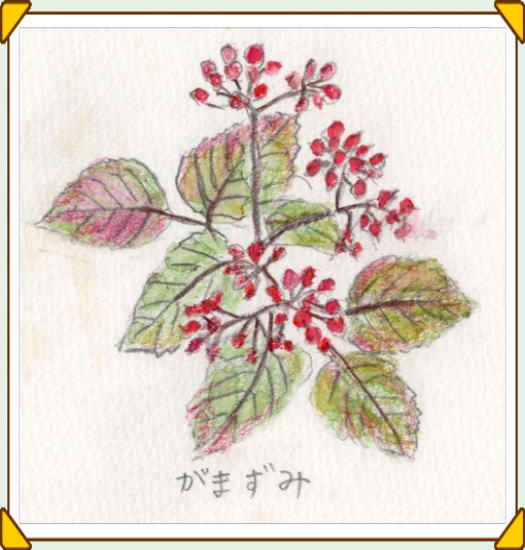 | がまずみ(莢蒾)は、10月の初め頃から実が赤く色づき始める。ミヤマガマズミ、コバノガマズミなど近い種類がいくつかあるが、実はどれも食用になる。 といっても、小さな実なので1つ1つ食べるよりは、完熟する前に集めてホワイトリカーなどに漬け果実酒にされることが多い。 霜が降りる頃になって完熟し、表面に少ししわがよりはじめた実は生食できる。甘いが、硬い種が口に残る。 ある程度の量が集められた時は、煮て、硬い種を濾し取ったあとで砂糖を加えて煮詰めるとフルーツソースができ、さらに煮て濃度を高めるとゼリー状になってジャムにもよい。 |