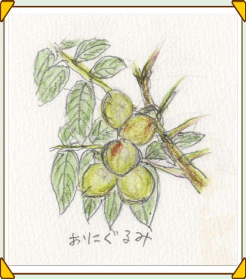 おにぐるみ(鬼胡桃)の木は、水気の多い川岸や沼の畔などによく育ち、大木になるものも多い。 2年前の10月末ごろに近郊の低山に登った時のこと。その道筋にあるダム湖の端におりてお昼にしようと、場所を探した。そして、上から見当をつけておいた草地へ行く途中で、湿り気のある地面のそこここにくるみの大きな緑の実が落ちているのに気付いた。 数本のくるみの木があって、見上げる枝にも数個連なった実が下がっていた。 ふつう、食用にするのは、この実の中の種のさらに内側の仁の部分なのだ。 実を土に埋めたり水に漬けたりして外側を腐らせて取除き、種の殻を割らなければ食べられない。おにぐるみの殻は非常に硬く、くるみ割りがこわれるほどだ。しかし、味は一般に売られている外来種よりもよいという人も多い。 市販のくるみは簡単に割ることができるが、それらはヨーロッパやアメリカから輸入したもので、おにぐるみとは別種のものだという。 秋田県の角館には、おにぐるみを味噌漬けにした郷土料理がある。6月に青い若い実を採り、水と糠を毎日換えて1ヶ月間あくを抜き、その後1年ごとに味噌を換えて3年漬けるのだそうだが、大変な手間と時間だ。その漬かった実は薄くスライスして食べるというが、一度、味わってみたいと願っている。 |
