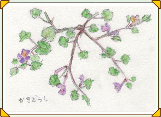 かきどおし(垣通し)は、かつては東京の住宅地の庭や路傍でも普通に見られた草だった。いまでは近くに畠などが少し残っているようなところまで行かないと、なかなか見つけられないかもしれない。 シソ科特有の断面が四角形の細い茎を四方八方に、地面を這うように伸ばし、細い柄のある1円硬貨ほどの葉を対生につける。 春には葉の付け根に小さいながら美しい赤味のある紫色の花を咲かせる。花が終わって夏になると茎の長さは1mにも及ぶほどに伸びて広がるので、垣通しの名がついたといわれている。 この草が食べられると知ったのは『食べる薬草事典』(村上光太郎/農文協)を読んでのことだった。 つい先日登った峰山の麓で群生しているを見つけたので、10cmほどの花つきの茎を一握り摘んで帰り、うすい衣のかき揚げにして食べてみた。シソ科に属するだけあって、かすかな香気が感じられた。同書によると、辛子バターを塗った食パンに生で散らしたサンドイッチもよいそうだ。 薬草としては、糖尿病、高血圧に効能があるという。 |
