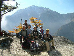 屋根岩(金峰山、居倉) 気候のいい時季なら必ず何人ものクモ男が張り付いている屋根岩の岩峰群も11月末ともなれば誰もいない。クモ男ではない我々も、最高点1906mの岩峰の基部までは踏跡を追ってたどりつける。横山厚夫さんをお迎えし、廻り目平からにぎやかに藪をこいだ。北側の武蔵野市の施設への径が拓かれているが、すこぶる急である。河原まで降り切れば、あとは白樺林の中、整備された散歩道をぶらぶらと起点まで帰ることができる、屋根岩完全一周コースである。 |