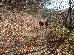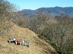 丸山は信州峠から飯盛山へ縦走時に通過する山で、この山に直接登ってやろうという物好きはごく少ない。ここに写っている人たちがその物好きである。ここから飯盛山への縦走路の展望はたぶんこのクラスの高さの山では日本一だと思う。日本百名山に限っても、少し数えただけで10座は見えた。実際にはもっとあるだろう。それでいて人はいないのだからこたえられない。マイカー登山に最適な周遊コースである。 |