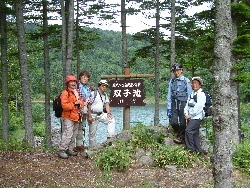 大河原峠〜北横岳(蓼科山) 大河原峠から霧の双子山を越えて双子池に着くころには晴れ間が広がった。幸先がいいかと思ったが、岩塊を乗り越え乗り越え、たどり着いた大岳の分岐あたりから風雨が強まり、久しぶりに雨具の世話になる。北横岳もまるで展望なし。風も強いのでさっさと亀甲池に下った。大岳への登りにくらべると歩きやすい径でたすかる。亀甲池で、いったん止んだ雨がまた降りだした。最後、大河原峠へとだらだらと長い登りを登り切って山歩きが終わる。 |