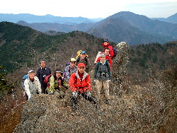 大口沢沿いにある岩崎ラジューム鉱泉跡から地形図の破線をたどって稜線に出る。尾根道はなかなか雰囲気がいいが、肝心の岩崎山は、西側の檜が伸びて、まるで愛想がない。早々に出発して、雲母山へ向かう。稜線から南アルプスの長大な山脈を望むことができた。雲母山からは、大口沢へ向かって恐ろしく急な尾根下りとなった。紆余曲折を経てやっと沢身に降り立つ。一同、ズボンは少々汚したものの、怪我もなく下ったのは幸いであった。