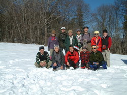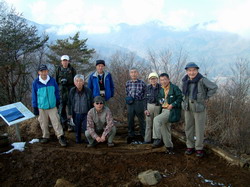 山田さんと横山さん、茗溪堂『静かなる山』の著者おふたりが参加、本の効果か、今ではこの山は有名山、とても静かなんてものではないらしい。それでも冬の平日とあって、ほとんど登山者はいなかった。頂上ではこの山に住み着いているという犬に迎えられた。下りは大月市街まで東に長く延びる尾根を下った。都留市側の植林地がまだ若く、好展望を楽しみながら下ることができたが、すべりやすい泥の斜面には苦労させられた。
