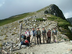 おびただしいイワカガミの咲く尾根を登り、いよいよたどり着いた頂上、帰りのバスまでにはたっぷりと時間があるから、のんびりできるはずだった。しかし、それもあっという間に感じることになった。1時間半、のんびりする暇もないくらい、四囲の山々が次々に雲の中から現れるのを、あちらを向き、こちらを向き、楽しんだのである。北岳、仙丈、アサヨ峰、そしてお待ちかねの甲斐駒、最後には地蔵のオベリスクまで望むことができた。 |
