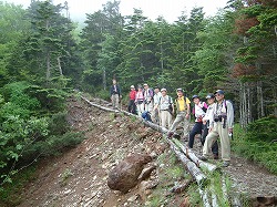 尾崎喜八がかの有名な「登りついて不意に開けた眼前の風景にしばらくは世界の天井が抜けたかと思う」の一節を書く題材になった、三城から百曲りを登るコースを選んだ。頂上台地も霧の中で「世界の天井が抜けた」とはいかなかったが、それはそれ、高原の霧を楽しむしかない。天気のおかげか人っ子ひとりおらず、広大な牧場の中を我々だけの行列が茶臼山へ向かった。茶臼山頂上でも展望を得ることはできなかった。 |