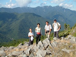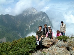 ロープウエイを使い、三ノ沢岳だけに絞った計画だから、時間に余裕がある。四方の景色を楽しみながらごくのんびりと歩いた。三ノ沢岳への稜線を進むにつれ、乗鞍岳が現れ、さらに槍穂が現れ、と飽きさせることがない。奇しくも今日はおとみさんの誕生日だという。きけばS沼さんの誕生日も数日後に迫っているとか。おとみさん自ら背負い上げた富良野ワインをあけ、O田さん差し入れのケーキを切り、山上のパーティとなった。