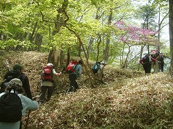 昨夏、はかばかしい展望がなかったのが残念だったので、今年はレンゲツツジの時季にあわせて計画してみたが、ところが木の病気だろうか、ことに牧場内ではほとんど全滅といってもいい状態だった。しかし、溶岩台地へと登りつめていく百曲の径の良さ、突如開ける大草原、茶臼山での展望、そして茶臼山西尾根のしっとりとした森の雰囲気、世にハイキングコースは数あれど、第一級の散策コースだとあらためて思った。 |