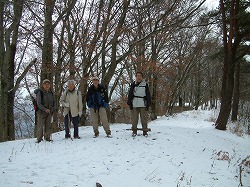 午後から雨の予報だったが、幸い登山口では薄日もさしていた。前山の向こうに白いアルプスの山並みもうっすらと見え、頂上での展望が期待されたが、結局それはならなかった。登るにつれ雪道となり、頂上付近ではまったくの冬景色となった。頂上南西の小ピークが展望台となっていて、展望案内図が置かれていたが、これがすべて見えたならすばらしいことだろうと想像された。頂上にある神社の休憩所を借りて弁当をつかった。