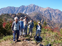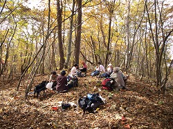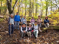大マテイ山(七保) 奈良倉山を大マテイ山に変更した。横山ご夫妻に加えて、初顔の4人が現地参加した。色づきがあまり良くないこの秋も、ここではまずまずで、鮮やかなモミジも多い。広い尾根には亭々たる巨樹が多いのに驚かされる。ことにブナの巨木が枝を空に広げる様は圧巻だった。ガサゴソと落葉を踏んで坂ともいえない山径をゆく気分はなんともいえない。初対面の方々とも和気あいあいと旧来の知己のようになるのも、こういった、先を急がない山の良さであろう。 |
