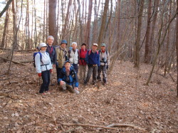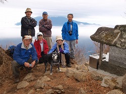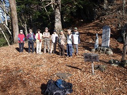 一般的には海岸寺峠東の1124mの三角点を海岸寺山と呼ぶが、この山の西、海岸寺峠をへだてて隆起する山を海岸寺山とするのが私の考えである。この山を頂点にした馬蹄形の尾根があって、それを一周たどるのなら、軽い薮山歩きとなる。桑原の墓地から尾根に入る。緩やかな尾根を北上して海岸寺比志線の車道へ出、海岸寺峠から海岸寺山に登った。頂稜の西端には石祠がある。納会は近所の予約制の店へ。今年一年の無事を祝って盛り上がった。