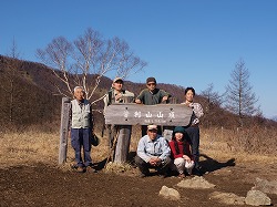 河口湖でW女史と合流して鹿留川池の平の登山口へ着いた。真っ青の快晴だが、山の西側の登山道にようやく日が射し始めるころには、背後に大きく富士がせりあがってきていた。妙心上人のお堂跡は今や礎石が残るのみの小広い平地で、葉の落ちたこの季節ではかなり展望もきく。このあたりから自然林が多くなって、頂稜に出ると圧巻となる。広い頂上には誰もいなかった。皇太子が登山したときに置かれたテーブルに陣取って、ワイワイと楽しんだ。