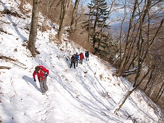 雲に覆われた南アルプス側から吹きつける風も、うまい具合に頂上には当たらないが、とはいっても寒い。そそくさと昼を終えると下山にかかった。帰りは堂平への道を下る。北向きをたどることの多い径は登りより雪が深いが、そのおかげで膝は楽である。