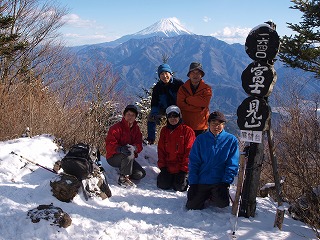 南アルプスや八ヶ岳は寒々しい雲に覆われているが、富士山方面の展望は申し分ない。登っている間にはわりと冷たい風にさらされたが、昼前に着いた頂上に風当たりはなく、山々を眺めながらの長い昼休みとなった。