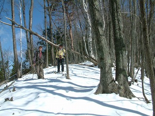 最後の150mはなかなかの急登だった。たどり着いた頂上は、案の定、赤松のびっしり植えられた、どこがピークかもわからない広い場所だった。もちろん展望もない。御料局三角点があったが、現在の三角点は見当たらない。雪に埋もれていたか、もう少し先にあったのか、もう面倒なので探しはしなかった。