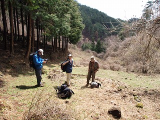 桜峠への古い峠道も途中からはほとんど藪に埋もれる。峠に至るまで、あたりは桑畑の跡ばかりである。たどり着いた桜峠には桜ならぬ梅が花盛りであった。ここから天狗山までは、なかなか一筋縄ではいかぬところで、しばしば地図とコンパスを取り出すことになった。
