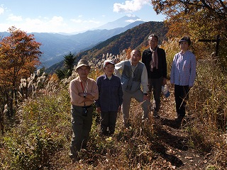 山梨県に2箇所だけの一等三角点の本点がある頂上は、毛無山の名前どおりの草原だったような記憶があったのだが、あるいは前回がもう葉の落ちきった時季だったからそう感じたのかもしれない。もっとも、木が成長したのは間違いなく、富士山方面に切り開きがあるとはいうものの、広い眺めというわけにはいかないのは、山の名前からすると残念な気もした。