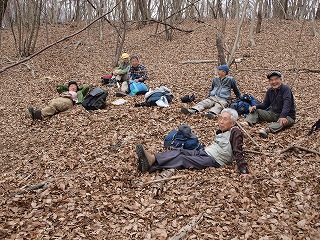 頂上付近は、信州のキノコ山のどこにでも見られるビニール紐がはりめぐらされていて見苦しい。それらが気にならない山の斜面で昼食のひとときを過ごした。薄日しか射さず、3月の末とはいえけっこう寒い。