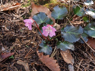 イワウチワの群落はちょっとした岩場を下った北側の鞍部である。花の時期はむずかしいので心配していたが、見事に咲いていた。やったやったと歓声が上がる。開いているもの、まだつぼみのもの、色の淡いもの濃いもの、変化があって楽しい。イワカガミはどこでも見かけるが、イワウチワの群落は私も初めてであった。