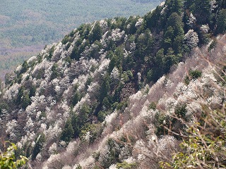 ひとしきりの撮影会が終わると、枝越しに山の斜面を埋める白いものが見えるのに気づいた。最初花崗岩のガレかと思ったが、双眼鏡でのぞくとタムシバの花らしい。少し登ったところからその斜面が眺められた。