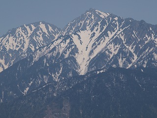 頂上に着いたころには北アルプス北部には雲がかかっていたが、大町市の北には残雪の北信の峰々を見ることができ、その同定に時間を費やした。