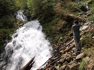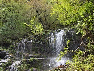 かなりの雨量のあとだから、何度もある徒渉が心配だったが、靴の中まで濡らしはしたものの、渡れないところはなかった。その雨量のおかげで、このコースのハイライトともいえる焼山滝が迫力を増しているのを観られたのは幸運であった。本流を落ちる雄滝の迫力もさることながら、その横の岩壁を落ちる雌滝の背景の新緑の美しさがすばらしい(いまどきは、雄滝と雌滝の名前を入れ替えたほうがいいとの声あり)。
