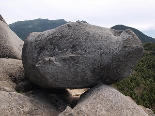 ここでお昼とすることにし、ザックを置いて、しばし岩の散歩とあいなった。岩の上に登ると金峰山がのしかかるように大きい。その稜線の面白い形の岩に富士山が重なっている。