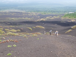 二ツ塚の低い方のピークでは風のせいでとても休憩できる状態ではなかった。下に見える林の中なら風も止むだろうと火山砂を蹴ってぐんぐん下る。林のあるくぼ地に入るとウソのように風もなくなった。
