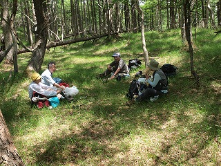 カラマツやダケカンバの林の中はオアシスのような草地になっていて、林を一歩出れば荒漠とした風景が広がっているとはとても思えない。「いいところだねえ」と横山さんのおなじみの感嘆詞も飛び出して長い昼休みとなった。