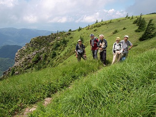 素晴らしいコースなのに人けがほとんどないのは、車で登れる山に歩いて登る物好きが少ないからで、これは私たちにとっては幸いなことである。昨日も降ってきたひとり以外に他の登山者はいなかった。北側から遊歩道で登ってこられる王ヶ鼻にもひとりの観光客の姿もなく、夏本番にはすこし早いからかと思われたが、肝心の北アルプスの展望は真夏らしく湧いた雲の中に隠されたままだった。