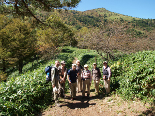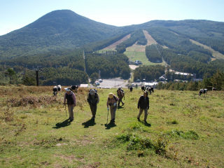 | 湯ノ丸山と烏帽子岳(嬬恋田代) 3年前の6月に木曜山行で出かけたものの、濃霧でまったく展望もないままだった湯ノ丸山、こんな天気ではと同時に登るつもりだった烏帽子岳は割愛して登山口に戻ったものだった。 展望を身上とする山で展望皆無では心が残る。再びと思っていたのをこの8月の丸山晩霞記念館行きに組み合わせた特別プランとしたが、それも悪天で中止となった。 三度目の正直を期した昨日、今までのうっぷんを晴らすかのような、文字通りの大晴天となった。浅間連山の山肌が近づくにつれくっきりしてきて、地藏峠へと車が登るにつれ空はいよいよ青い。 紅葉には少し早いこの時季、この好天というのに地藏峠の駐車場に停まる登山者のものらしき車もまばらである。レンゲツツジや紅葉の盛りには駐車場所さがしに苦労することを思えばウソのような話である。 スキー場の草地に放牧された乳牛の群れをすりぬけて登っていくと、たおやかな湯ノ丸山の姿が現れる。前回、まるで見なかった光景なので初めて来るようなものである。背後には浅間山が頭を出し始め、私にはなじみのない関東地方北部の山々がずらりと並ぶ。 少々の急登をこなして登りついた広い頂上からは、今まではこの山に隠されていた北アルプス方面の景色が一気に拡がった。富士山から北アルプスの北の果てまでが一望なのだから、我が国を代表する中部山岳のほとんどを眺められることになる。唯一、はかばかしく観ることのできない南アルプスも、八ヶ岳に重なって、北岳や甲斐駒仙丈らしき峰頭をもたげているのがご愛嬌である。 いったんもったいないくらい降って、登り返して烏帽子岳へ向かう。その稜線に着くとますます北アルプスは近づいて、上田の街並みははるかに低い。わが青春の思い出のある菅平を見下ろして、あの夏、あそこからこのピークも見えていたのだなと思った。 名残は尽きない。後ろ髪を引かれながら湯ノ丸山の巻道を地藏峠に戻る。平坦で眠たくなるような道も、足元に気をつかわず余韻を楽しみながら歩くには好都合であった。 |
