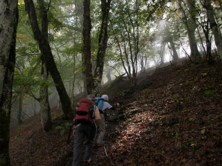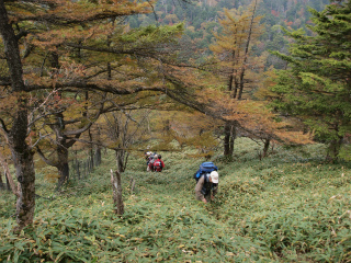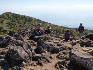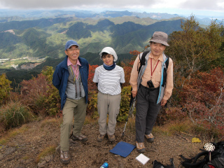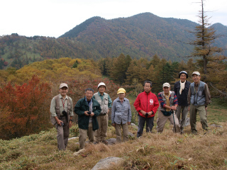 | 茂来山(海瀬) 佐久平北側の山々へ向かうとき、行く手にもっとも目立つのは浅間山に決まっているが、その帰り、また千曲川の谷に入っていくとき、行く手にもっともりりしいのは茂来山である。 先週、湯ノ丸山からの帰りにもその茂来山を見て、次週に計画していた金峰山を中止にしたときには代わりに茂来山にしようと考えた。そして結局、そうなったのであった。 過去2度登った霧久保沢ではなく、槙沢からのルートを登ることにし、登山口を目指す。予報は雨のち晴れだったので、急速に回復するのだろうと思ったが、雨こそやんだものの、太陽はいっこうに顔を見せない。それでも、沢沿いの登山道は気分のよい径で、のんびりと登っていくことができた。 登山口への林道で佐久穂町のスクールバス2台とすれ違ったので、これは地元の学校の遠足か何かに違いないと思ったが案の定だった。登るうち、上の方から子供たちの歓声が聞こえてきた。あちらの方が速いとは思うが、追いついてしまっても困るのでなるたけ休み休み登る。 沢の源頭を登りきって茂来山から北西に延びる尾根に乗るといよいよ樹林がすばらしい。まだ紅葉の盛りには早いが、その時季にはさぞやと思われた。ひとしきりの尾根道の急登の間もときおり太陽が出て、このまま一気に晴れるかと思ったが、すぐにまた雲がおおってしまう。 頂上のすぐ下の草地では佐久中央小学校の4年生一行が昼の弁当を広げていた。しばらくにぎやかだったが、彼らが下ったあとはしんとなった。他に登山者は誰もいない。我々は、いずれ雲が取れるに違いないと長居を決め込むことにした。 そして頂上滞在2時間にもなろうとするころ、ついに幕があいた。八ヶ岳こそ最後まで雲が取れなかったが、それ以外の山々はほぼ見渡せるようになった。次々に現れる四囲の風景に、皆頂上でぐるぐる回った。2時間20分、木曜山行史上に残る頂上滞在時間であった。 |