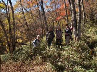 尾根の末端から取り付くとすぐに防火線が始まる。斉木林道に合するまでの標高差400mを、ミズナラやハルニレの大木を愛で、徐々に拡がる展望を楽しみ、しかも秋たけなわの色に歓声をあげ、秋の冷涼な気候にまるで汗すらかかないまま登った。