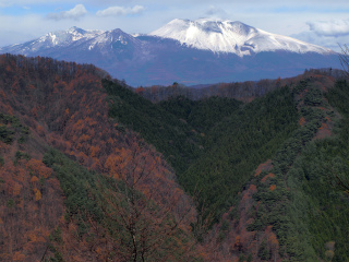地図から読んだ稜線は、伐採跡で歩きにくいところもあったが、そのおかげで浅間山がすっきり望める場所もあった。快調に榊山三角点に達して、陽だまりで昼休みとした。