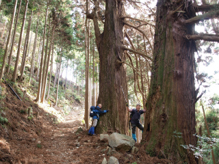 高座石の裏手から北へと登っていく径は今では地図から破線も消えているが、久遠寺から七面山へ向かう最短路としてかつてはにぎわったことだろう。何百年前からここにあったのだろうかというような杉の大木が径沿いに何本もあるのが、往時の重要な参道であったことを偲ばせる。今、これを登って赤沢宿へ下る人など年に数えるほどであろう。