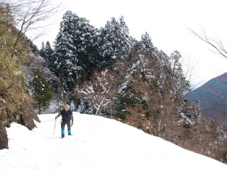 標高600mを越えたあたりで突然雪が深くなった。感井坊へは最後わりと長い林道歩きがある。関係者が見回りに来たのか1台分の轍があって、歩きづらいながらもそれをたどればツボ足歩行の苦労もなかったが、轍は千本杉までだった。その後は里で言われた40センチというのもあながち大げさでもないような積雪で、斜面の急なところでは雪崩も起きて道を埋めている。足跡ひとつないのは気持ちがいいが、それも最初のうちだけで、やがてうんざりする。