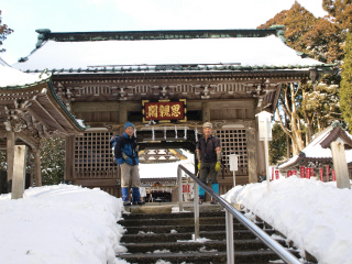 宿坊街を登山姿で歩く我々に後ろから声をかける人がいた。山には40センチもの積雪があるからと心配して声をかけてくれたのだが、そのあたりでは全くといっていいほど雪は消えており、家の前にうずたかく雪の積もった場所からやってきた我々には、この上にそんなに雪があるとも思えなかった。