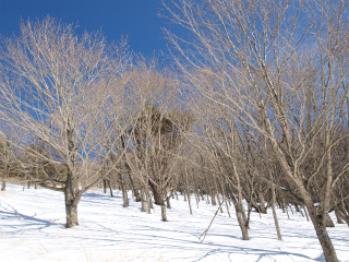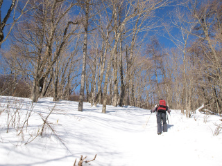 しかしそこは小日向山の北に拡がるミズナラ主体の広く明るい林で、ここへ来ただけでも歩いた甲斐があったというもの。広い雪面は小さい獣の足跡以外にまったく傷のない美しさ、空はあくまで青い。林のむこうには浅間山が見えている。