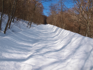 斜尾山へと向かう林道は冬以外でも一般車は入れない。まさか冬に除雪することもないだろうと思っていたら、除雪した跡があった。歩いている最中に追いついてきた車に乗った地元の猟師が森林組合で除雪したと教えてくれた。しかしそれもかなり前のことらしく、さらにその上にしっかりと積もっていた。もし一度も除雪されていなければ相当苦労させられたことだろう。