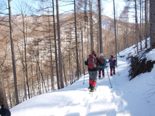 | 夕日アタリ(御所平) 今回の木曜山行は黒打ノ頭であったが、珍しく地元に雪らしい雪があるし、おそらく今季はこれが最後になるだろうしで、スノーシュー遊びに変更することにした。それを書いた掲示板を見て、去年の蛾ヶ岳以来のWさんと、その友人Iさんがこれは初参加することになった。スノーシューには乙女心をそそるものがあるらしい。 さてそのフィールドだが、これは5年ぶりとなる、高登谷高原南の甲信国境稜線を選んだ。一応目的地は「夕日アタリ」だが、この行程での最高点は石コツである。もっとも石コツはスノーシューでは面倒だから巻くことにしたので、その手前の1605mピークが昨日の最高点であった。 無風快晴、絶好のスノーシュー日和であった。国境稜線まではまったくのバージンスノーだったが、稜線には踏跡があった。家に帰ってからインターネットを見ると、数日前に歩いた報告があったので、今はこんなことまですぐにわかってしまうのだなあとびっくり。この人は信州峠からフシノソリを往復したという。http://gun-mtido.sakura.ne.jp/yuhiatari.html たどり着いた1605mピークは眺めのよいところだったが、それは相変わらず、八ヶ岳もさることながら横尾山がどっしりと立派なのが、日ごろ、のっぺりした姿の横尾山しか見ていない目には新鮮である。 しかしその直下の斜面には変化があって、あらたに落葉松が植えられ、周囲は鹿柵が張り巡らされていた。その鹿柵に沿って少しくだり、石コツを巻いてまた稜線に戻った。 夕日アタリの手前のピークで昼休み。無風で暖かく、いつまでも休んでいたい平和な雪上でたっぷり1時間を過ごした。 夕日アタリは三角点があるだけの眺めのないピークだが、北麓から見るとなかなかきれいな三角形をしている。北麓住民がその頂点に夕日があたるのを時間の目安にしたことが山名の由来になっているのだろう。 ここからの北尾根の下りがスノーシューの醍醐味が味わえると思ってのコース設定だったが、途中、地図にない林道に少々邪魔されたものの、雪を蹴散らして一気に麓に下ることができた。無雪期ならこうはいかないだろう。 山中に鹿柵が巡らされているのが最近私がこの山域に行かない理由で、山から出るに出られなくなることがあるからだが、その出口もうまい具合に見つかって終りよければすべて良しの幕切れとなった。 |