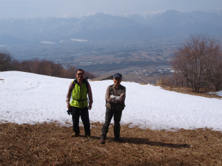 | 光城山〜長峰山(豊科・明科) 今週の木曜山行は陣馬形山の予定だったが、長野全県が好天の予報に、それなら安曇野に北アルプスを眺めに行こうと考えが変わった。北アルプス展望となると、この時期気軽に登れるのは光城山と長峰山である。 これまで2度木曜山行でも歩いており、勝手知ったる山である。その2度とも今回とほとんど同じ時期で、たまには他の季節にと思わないではないが、桜の頃にはいくらきれいでも人ごみの中を登るのはごめんだし、頂上に通じる車道が通行できる季節も敬遠したいで、どうしてもこの時期になってしまう。 光城山への桜並木の尾根は冬はアイゼンが必要だが、今回はほとんど雪はなかった。わりと多くの人とすれ違うのは、毎日のように登っている地元の人がいるからだろう。 好天ではあるが北アルプスが少しぼんやりしているのは春らしい。気温も上がってのんびりした気分である。長峰山への車道歩きも行き交う車がなければしごくのんびりとしたものだ。途中、稜線をたどって少々変化をつけた。稜線の東側には廃村があって、尾根沿いには古い墓がいくつも残っていた。 長峰山ではなにやら工事の真っ最中であった。展望台を建て直すらしいが、どうもそれ以外にも建設するようだ。重機がたくさん上がっていたが、この機会に、山頂を台無しにしている意味不明のモニュメントを撤去してほしいものだ。 白かった空が少々青くなって、北アルプスもはっきりしてきた。それを眺めながらゆっくりと昼休みをした。常念岳の展望台としてこれ以上の山頂はないだろう。 一般道を長峰荘へ下ると駐車場へは遠回りになるので、途中から藪尾根を下ったが、これがなかなか快適に下れる尾根で、駐車場まで舗装路歩きをせずにすんだ。 |